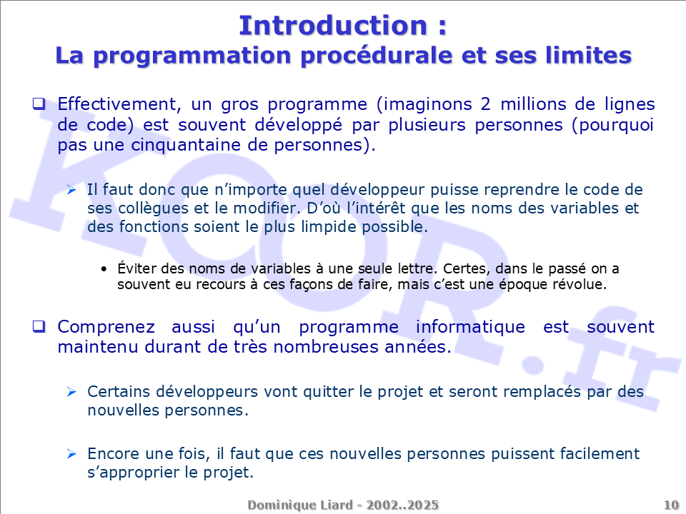Effectivement, un gros programme (imaginons 2 millions de lignes de code) est souvent développé par plusieurs personnes (pourquoi pas une cinquantaine de personnes). Il faut donc que n'importe quel développeur puisse reprendre le code de ses collègues et le modifier. D'où l'intérêt que les noms des variables et des fonctions soient le plus limpide possible. Éviter des noms de variables à une seule lettre. Certes, dans le passé on a souvent eu recours à ces façons de faire, mais c'est une époque révolue. Comprenez aussi qu'un programme informatique est souvent maintenu durant de très nombreuses années. Certains développeurs vont quitter le projet et seront remplacés par des nouvelles personnes. Encore une fois, il faut que ces nouvelles personnes puissent facilement s'approprier le projet.
