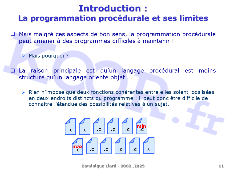 Introduction - La programmation procédurale et ses limites Mais malgré ces aspects de bon sens, la programmation procédurale peut amener à des programmes difficiles à maintenir ! Mais pourquoi ? La raison principale est qu'un langage procédural est moins structuré qu'un langage orienté objet. Rien n'impose que deux fonctions cohérentes entre elles soient localisées en deux endroits distincts du programme : il peut donc être difficile de connaitre l'étendue des possibilités relatives à un sujet.