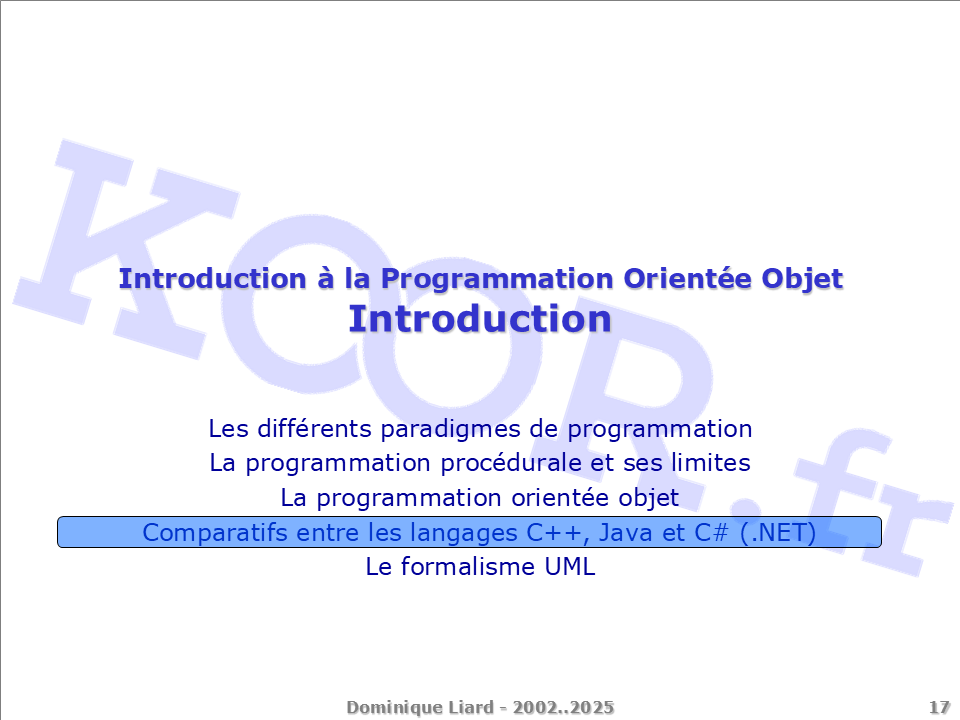 Les différents paradigmes de programmation La programmation procédurale et ses limites La programmation orientée objet Comparatifs entre les langages C++, Java et C# (.NET) Le formalisme UML