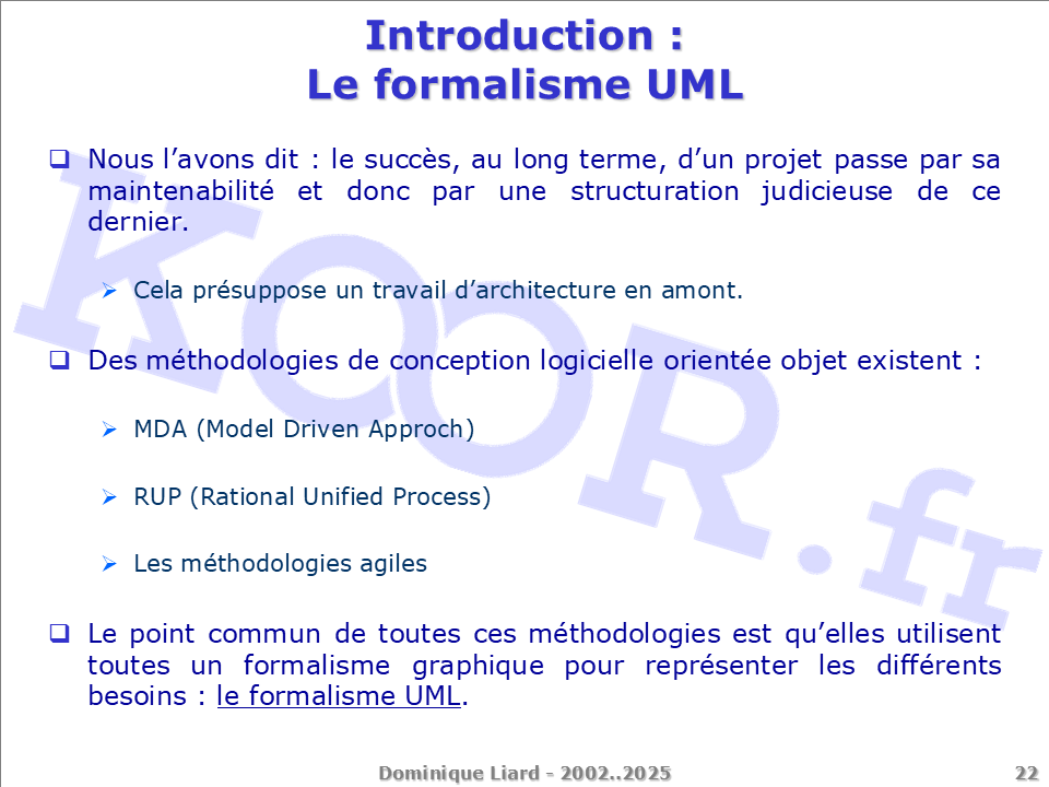 Introduction - Le formalisme UML Nous l'avons dit : le succès, au long terme, d'un projet passe par sa maintenabilité et donc par une structuration judicieuse de ce dernier. Cela présuppose un travail d'architecture en amont. Des méthodologies de conception logicielle orientée objet existent : MDA (Model Driven Approch) RUP (Rational Unified Process) Les méthodologies agiles Le point commun de toutes ces méthodologies est qu'elles utilisent toutes un formalisme graphique pour représenter les différents besoins : le formalisme UML.