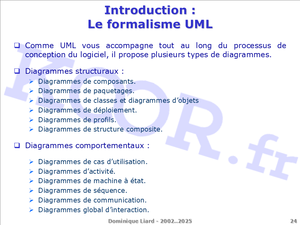 Introduction - Le formalisme UML Comme UML vous accompagne tout au long du processus de conception du logiciel, il propose plusieurs types de diagrammes. Diagrammes structuraux : Diagrammes de composants. Diagrammes de paquetages. Diagrammes de classes et diagrammes d'objets Diagrammes de déploiement. Diagrammes de profils. Diagrammes de structure composite. Diagrammes comportementaux : Diagrammes de cas d'utilisation. Diagrammes d'activité. Diagrammes de machine à état. Diagrammes de séquence. Diagrammes de communication. Diagrammes global d'interaction.
