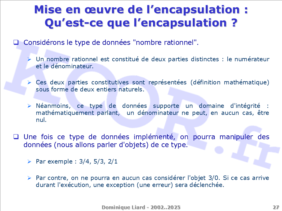 Mise en ?uvre de l'encapsulation - Qu'est-ce que l'encapsulation ? Considérons le type de données "nombre rationnel". Un nombre rationnel est constitué de deux parties distinctes : le numérateur et le dénominateur. Ces deux parties constitutives sont représentées (définition mathématique) sous forme de deux entiers naturels. Néanmoins, ce type de données supporte un domaine d'intégrité : mathématiquement parlant, un dénominateur ne peut, en aucun cas, être nul. Une fois ce type de données implémenté, on pourra manipuler des données (nous allons parler d'objets) de ce type. Par exemple : 3/4, 5/3, 2/1 Par contre, on ne pourra en aucun cas considérer l'objet 3/0. Si ce cas arrive durant l'exécution, une exception (une erreur) sera déclenchée.
