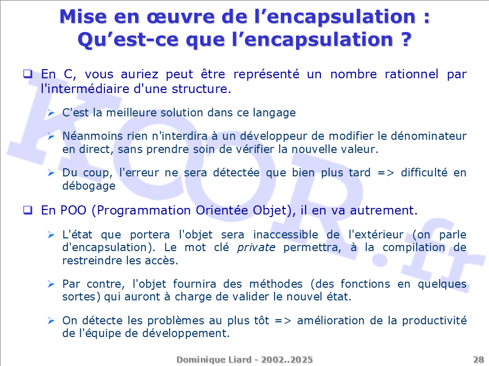 En C, vous auriez peut être représenté un nombre rationnel par l'intermédiaire d'une structure. C'est la meilleure solution dans ce langage Néanmoins rien n'interdira à un développeur de modifier le dénominateur en direct, sans prendre soin de vérifier la nouvelle valeur. Du coup, l'erreur ne sera détectée que bien plus tard => difficulté en débogage En POO (Programmation Orientée Objet), il en va autrement. L'état que portera l'objet sera inaccessible de l'extérieur (on parle d'encapsulation). Le mot clé private permettra, à la compilation de restreindre les accès. Par contre, l'objet fournira des méthodes (des fonctions en quelques sortes) qui auront à charge de valider le nouvel état. On détecte les problèmes au plus tôt => amélioration de la productivité de l'équipe de développement.