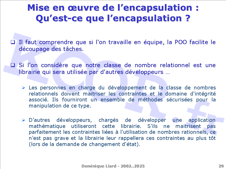 Il faut comprendre que si l'on travaille en équipe, la POO facilite le découpage des tâches. Si l'on considère que notre classe de nombre relationnel est une librairie qui sera utilisée par d'autres développeurs ? Les personnes en charge du développement de la classe de nombres relationnels doivent maitriser les contraintes et le domaine d'intégrité associé. Ils fourniront un ensemble de méthodes sécurisées pour la manipulation de ce type. D'autres développeurs, chargés de développer une application mathématique utiliseront cette librairie. S'ils ne maitrisent pas parfaitement les contraintes liées à l'utilisation de nombres rationnels, ce n'est pas grave et la librairie leur rappellera ces contraintes au plus tôt (lors de la demande de changement d'état).