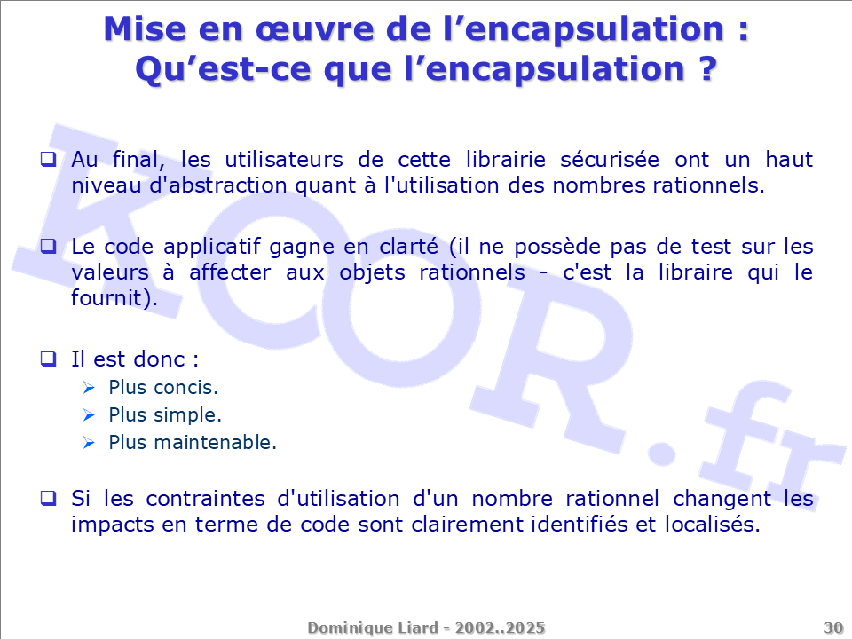 Mise en ?uvre de l'encapsulation - Qu'est-ce que l'encapsulation ? Au final, les utilisateurs de cette librairie sécurisée ont un haut niveau d'abstraction quant à l'utilisation des nombres rationnels. Le code applicatif gagne en clarté (il ne possède pas de test sur les valeurs à affecter aux objets rationnels - c'est la libraire qui le fournit). Il est donc : Plus concis. Plus simple. Plus maintenable. Si les contraintes d'utilisation d'un nombre rationnel changent les impacts en terme de code sont clairement identifiés et localisés.
