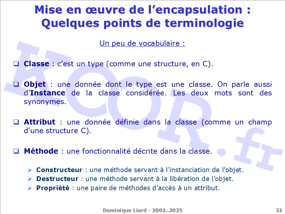 Mise en ?uvre de l'encapsulation - Quelques points de terminologie Un peu de vocabulaire : Classe : c'est un type (comme une structure, en C). Objet : une donnée dont le type est une classe. On parle aussi d'Instance de la classe considérée. Les deux mots sont des synonymes. Attribut : une donnée définie dans la classe (comme un champ d'une structure C). Méthode : une fonctionnalité décrite dans la classe. Constructeur : une méthode servant à l'instanciation de l'objet. Destructeur : une méthode servant à la libération de l'objet. Propriété : une paire de méthodes d'accès à un attribut.