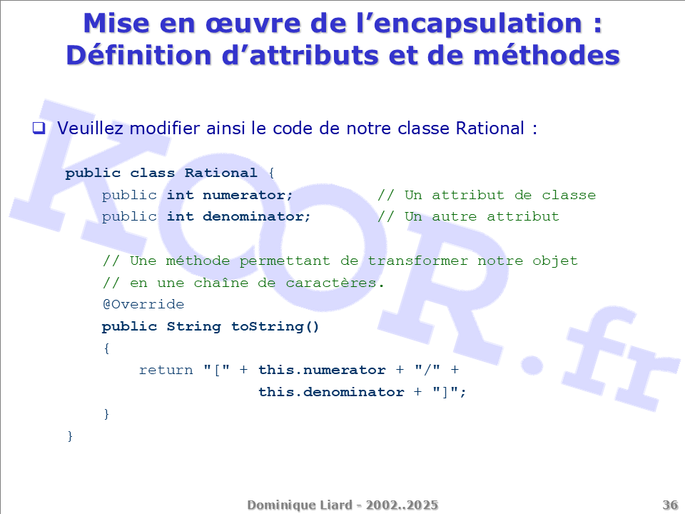 Mise en ?uvre de l'encapsulation - Définition d'attributs et de méthodes Veuillez modifier ainsi le code de notre classe Rational : public class Rational { public int numerator; // Un attribut de classe public int denominator; // Un autre attribut // Une méthode permettant de transformer notre objet // en une chaîne de caractères. @Override public String toString() { return "[" + this.numerator + "/" + this.denominator + "]"; } }