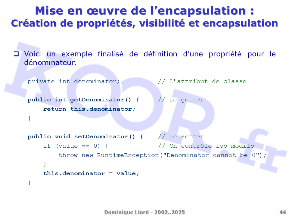 Mise en ?uvre de l'encapsulation - Création de propriétés, visibilité et encapsulation Voici un exemple finalisé de définition d'une propriété pour le dénominateur. private int denominator; // L'attribut de classe public int getDenominator() { // Le getter return this.denominator; } public void setDenominator() { // Le setter if (value == 0) { // On contrôle les modifs throw new RuntimeException("Denominator cannot be 0"); } this.denominator = value; }