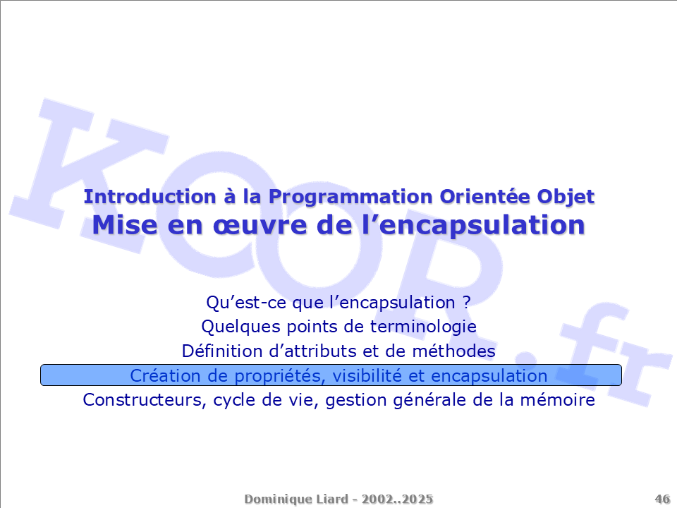 Introduction à la Programmation Orientée Objet - Mise en ?uvre de l'encapsulation Qu'est-ce que l'encapsulation ? Quelques points de terminologie Définition d'attributs et de méthodes Création de propriétés, visibilité et encapsulation Constructeurs, cycle de vie, gestion générale de la mémoire