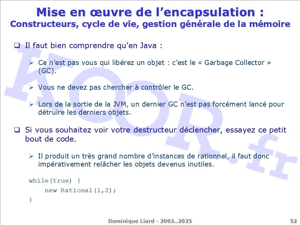 Mise en ?uvre de l'encapsulation - Constructeurs, cycle de vie, gestion générale de la mémoire Il faut bien comprendre qu'en Java : Ce n'est pas vous qui libérez un objet : c'est le « Garbage Collector » (GC). Vous ne devez pas chercher à contrôler le GC. Lors de la sortie de la JVM, un dernier GC n'est pas forcément lancé pour détruire les derniers objets. Si vous souhaitez voir votre destructeur déclencher, essayez ce petit bout de code. Il produit un très grand nombre d'instances de rationnel, il faut donc impérativement relâcher les objets devenus inutiles. while(true) { new Rational(1,2); }