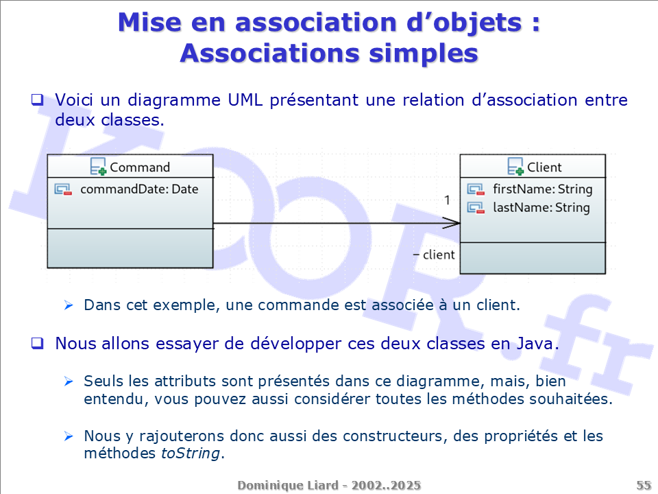 Mise en association d'objets - Associations simples Voici un diagramme UML présentant une relation d'association entre deux classes. Dans cet exemple, une commande est associée à un client. Nous allons essayer de développer ces deux classes en Java. Seuls les attributs sont présentés dans ce diagramme, mais, bien entendu, vous pouvez aussi considérer toutes les méthodes souhaitées. Nous y rajouterons donc aussi des constructeurs, des propriétés et les méthodes toString.