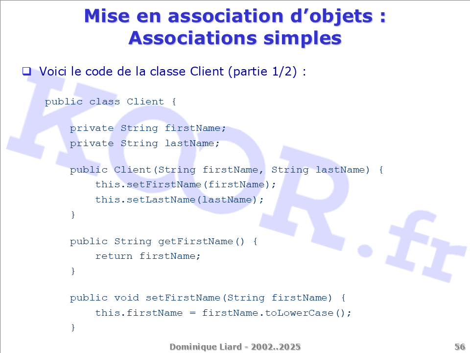 Mise en association d'objets - Associations simples Voici le code de la classe Client (partie 1/2) : public class Client { private String firstName; private String lastName; public Client(String firstName, String lastName) { this.setFirstName(firstName); this.setLastName(lastName); } public String getFirstName() { return firstName; } public void setFirstName(String firstName) { this.firstName = firstName.toLowerCase(); }