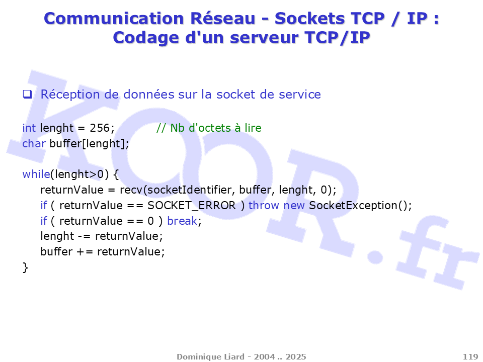 Communication Réseau - Sockets TCP / IP - Codage d'un serveur TCP/IP Réception de données sur la socket de service int lenght = 256; // Nb d'octets à lire char buffer[lenght]; while(lenght>0) { returnValue = recv(socketIdentifier, buffer, lenght, 0); if ( returnValue == SOCKET_ERROR ) throw new SocketException(); if ( returnValue == 0 ) break; lenght -= returnValue; buffer += returnValue; }