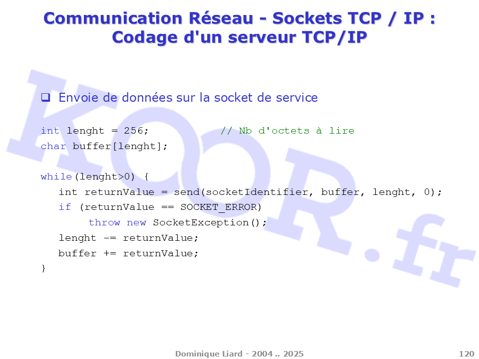 Communication Réseau - Sockets TCP / IP - Codage d'un serveur TCP/IP Envoie de données sur la socket de service int lenght = 256; // Nb d'octets à lire char buffer[lenght]; while(lenght>0) { int returnValue = send(socketIdentifier, buffer, lenght, 0); if (returnValue == SOCKET_ERROR) throw new SocketException(); lenght -= returnValue; buffer += returnValue; }