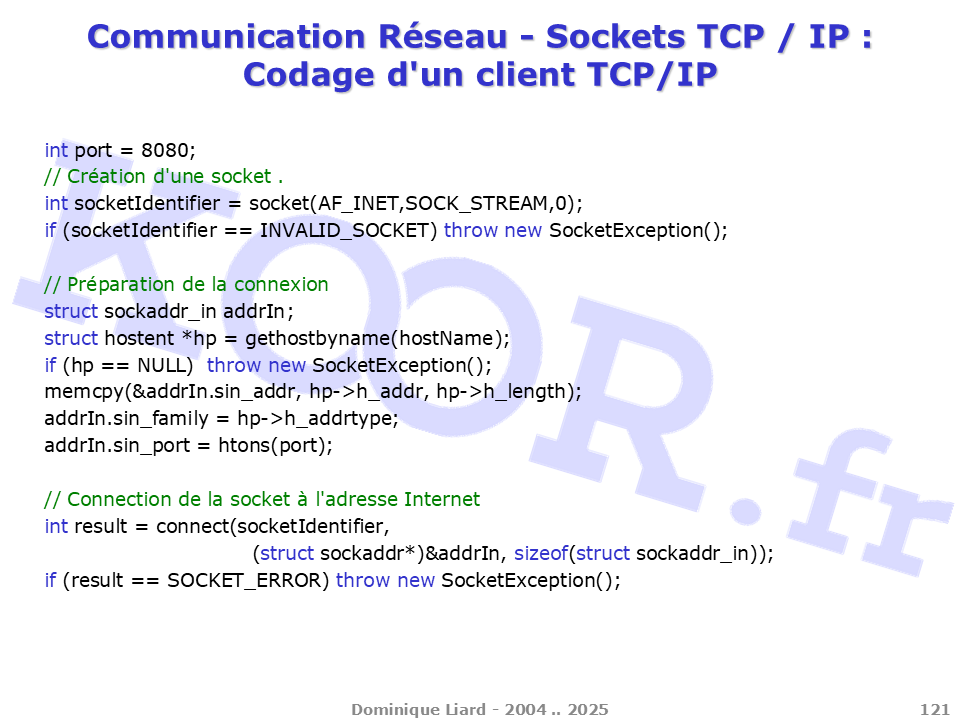 Communication Réseau - Sockets TCP / IP - Codage d'un client TCP/IP int port = 8080; // Création d'une socket . int socketIdentifier = socket(AF_INET,SOCK_STREAM,0); if (socketIdentifier == INVALID_SOCKET) throw new SocketException(); // Préparation de la connexion struct sockaddr_in addrIn; struct hostent *hp = gethostbyname(hostName); if (hp == NULL) throw new SocketException(); memcpy(&addrIn.sin_addr, hp->h_addr, hp->h_length); addrIn.sin_family = hp->h_addrtype; addrIn.sin_port = htons(port); // Connection de la socket à l'adresse Internet int result = connect(socketIdentifier, (struct sockaddr*)&addrIn, sizeof(struct sockaddr_in)); if (result == SOCKET_ERROR) throw new SocketException();