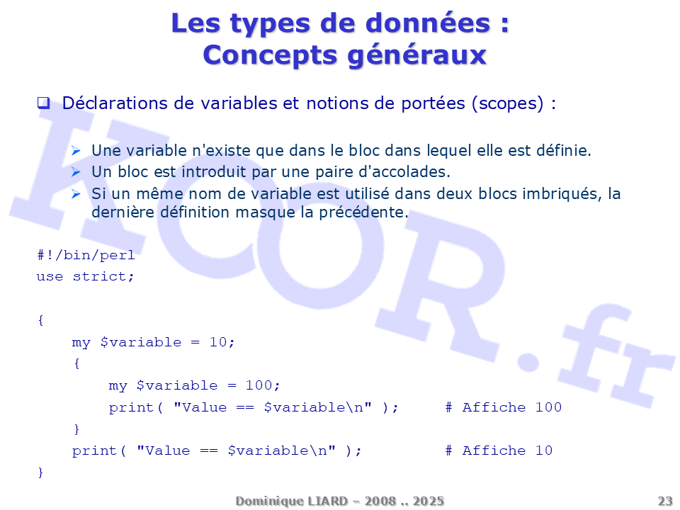 Les types de données - Concepts généraux Déclarations de variables et notions de portées (scopes) : Une variable n'existe que dans le bloc dans lequel elle est définie. Un bloc est introduit par une paire d'accolades. Si un même nom de variable est utilisé dans deux blocs imbriqués, la dernière définition masque la précédente. #!/bin/perl use strict; { my $variable = 10; { my $variable = 100; print( "Value == $variable\n" ); # Affiche 100 } print( "Value == $variable\n" ); # Affiche 10 }