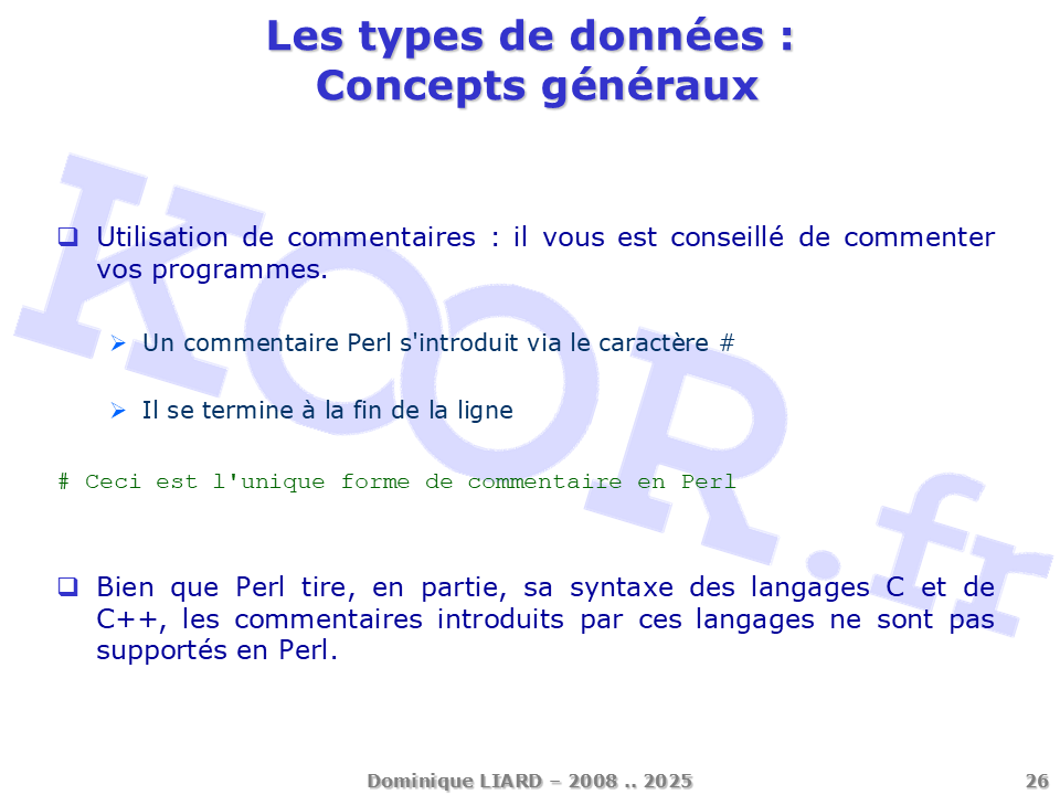 Les types de données - Concepts généraux Utilisation de commentaires : il vous est conseillé de commenter vos programmes. Un commentaire Perl s'introduit via le caractère # Il se termine à la fin de la ligne # Ceci est l'unique forme de commentaire en Perl Bien que Perl tire, en partie, sa syntaxe des langages C et de C++, les commentaires introduits par ces langages ne sont pas supportés en Perl.