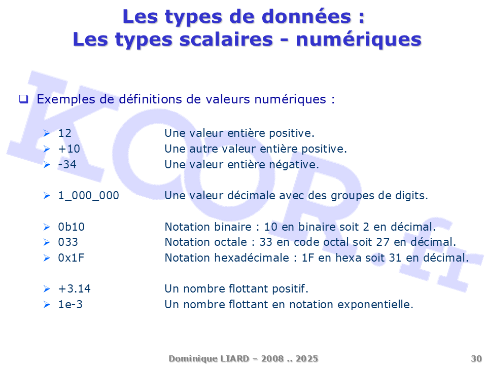 Les types de données - Les types scalaires - numériques Exemples de définitions de valeurs numériques : 12 Une valeur entière positive. +10 Une autre valeur entière positive. -34 Une valeur entière négative. 1_000_000 Une valeur décimale avec des groupes de digits. 0b10 Notation binaire : 10 en binaire soit 2 en décimal. 033 Notation octale : 33 en code octal soit 27 en décimal. 0x1F Notation hexadécimale : 1F en hexa soit 31 en décimal. +3.14 Un nombre flottant positif. 1e-3 Un nombre flottant en notation exponentielle.