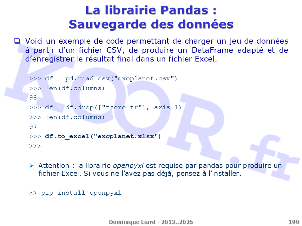 <h1>La librairie Pandas - Sauvegarde des données</h1> <p>Voici un exemple de code permettant de charger un jeu de données à partir d'un fichier CSV, de produire un DataFrame adapté et de d'enregistrer le résultat final dans un fichier Excel. >>> df = pd.read_csv("exoplanet.csv") >>> len(df.columns) 98 >>> df = df.drop(["tzero_tr"], axis=1) >>> len(df.columns) 97 >>> df.to_excel("exoplanet.xlsx") >>> Attention : la librairie openpyxl est requise par pandas pour produire un fichier Excel. Si vous ne l'avez pas déjà, pensez à l'installer. $> pip install openpyxl</p>