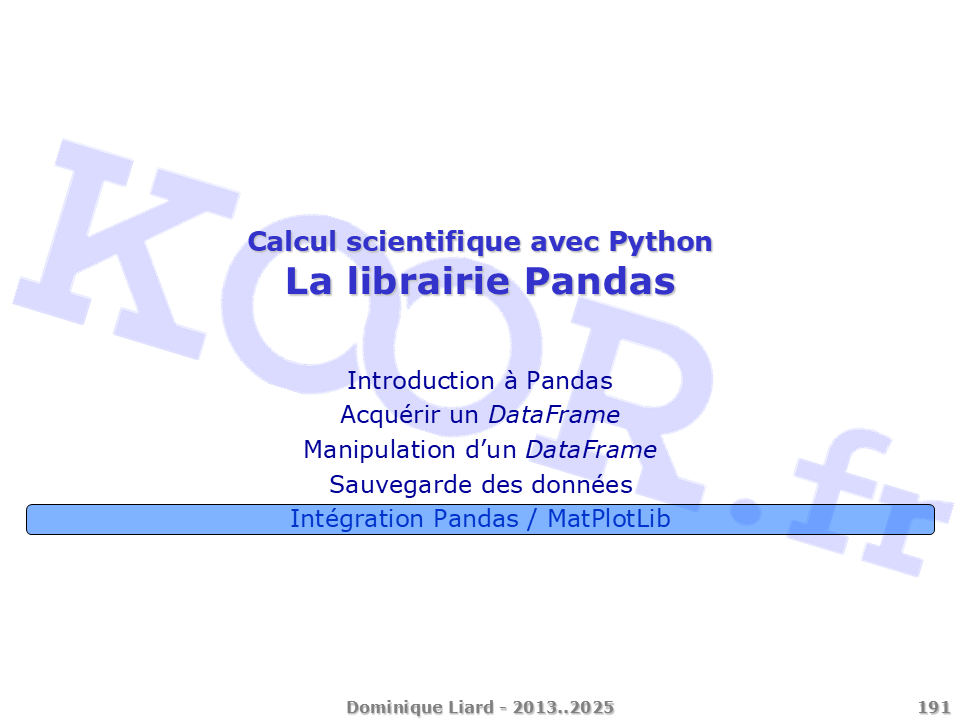<h1>La librairie Pandas</h1> <p>Introduction à Pandas Acquérir un DataFrame Manipulation d'un DataFrame Sauvegarde des données Intégration Pandas / MatPlotLib</p>
