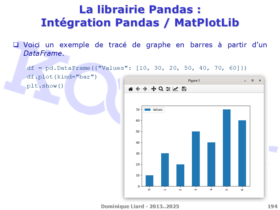 <h1>La librairie Pandas - Intégration Pandas / MatPlotLib</h1> <p>Voici un exemple de tracé de graphe en barres à partir d'un DataFrame. df = pd.DataFrame({"Values": [10, 30, 20, 50, 40, 70, 60]}) df.plot(kind="bar") plt.show()</p>