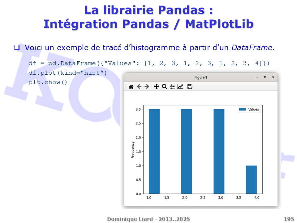 <h1>La librairie Pandas - Intégration Pandas / MatPlotLib</h1> <p>Voici un exemple de tracé d'histogramme à partir d'un DataFrame. df = pd.DataFrame({"Values": [1, 2, 3, 1, 2, 3, 1, 2, 3, 4]}) df.plot(kind="hist") plt.show()</p>